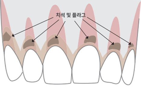 치석이 계속 쌓이면 치아와 잇몸 사이가 벌어지게 되고 그 공간으로 세균이 감염되어 염증을 발생시킵니다.
