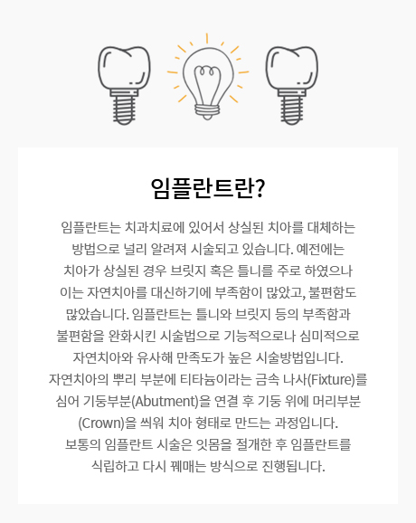 아무리 임플란트 뿌리와 기둥을 잘 심었다 한들 잇몸이 아물지 않으면 소용이 없기 때문에 잇몸의 회복은 임플란트의 성공에 아주 중요한 부분입니다.