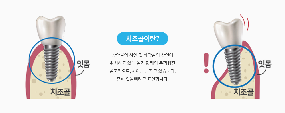 치아 발치 후 시간이 지나면 치조골이 손실되기 시작하는데 치조골은 치아를 붙잡아 고정시켜주는 뼈이기 때문에 치조골이 부족한 상태로 임플란트 식립을 진행할 수 없으며, 무리해서 진행한다 하더라도 임플란트를 꽉 잡아줄 치조골이 부족하기 때문에 임플란트가 흔들리거나 빠져나오게 됩니다.