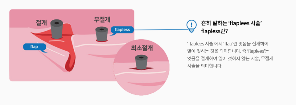 보통의 임플란트 시술은 잇몸을 절개한 후 임플란트를 식립하고 다시 꿰매는 방식으로 진행되지만 이러한 절개 시술법은 큰 통증과 많은 출혈이 발생하며 잇몸의 붓기가 약 1주일 지속되는 등 시술 후의 불편함이 큰 시술법입니다.